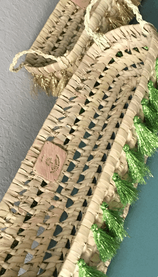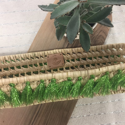 This beautiful basket is made by local artisans in Morocco and covered in green metallic tassels. It will add an instant glamorous touch to your table...
