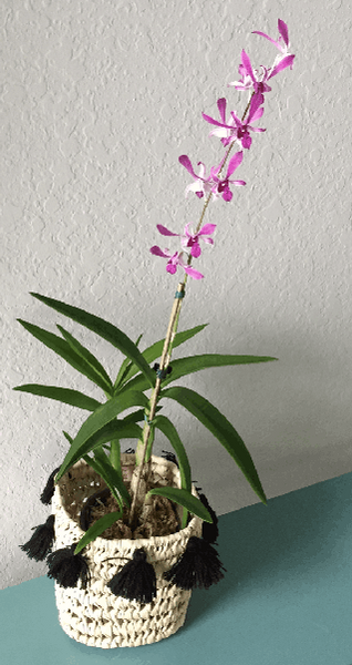 Hand-woven with straw and cotton tassels.