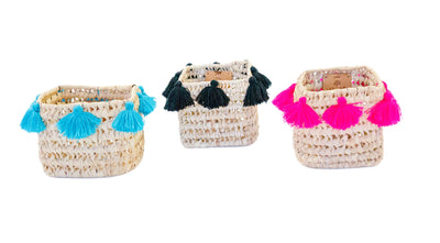 This cute little basket is hand-woven by local artisans and the tassels are each hand tied and applied by a women's cooperative in Marrakesh. Perfect in an entrance hall to wrangle all your keys, on the tabletop to serve cracker or as a lovely boho planter!