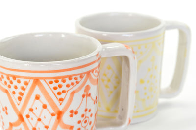 Set of 2 porcelain mugs (yellow and orange), Hand thrown and painted in Marrakesh, Morocco with traditional Safi pattern.