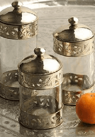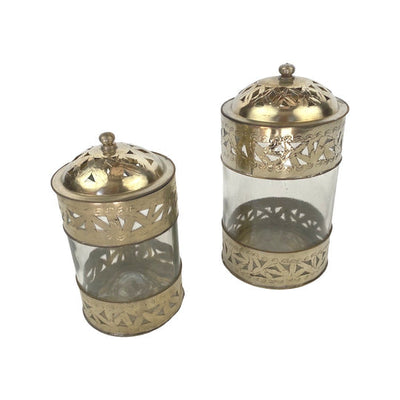 The hand hammered and cut out design on the nickel metalwork applied to these glass jars make them a lovely addition to your vanity or where ever you need to store bits and bobs. Perfect for cotton swabs and pads!