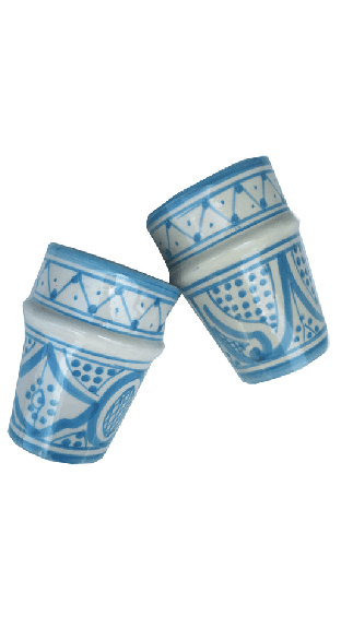 Our MODERN MOROCCAN Safi tea cups in the traditional Beldi shape come in SAFI and in BULLSEYE and we offer 6 different color ways so that you can mix and match to your heart’s content.  Whether for wine, water, tea, coffee or individual flower arrangements, these add style to any table setting!