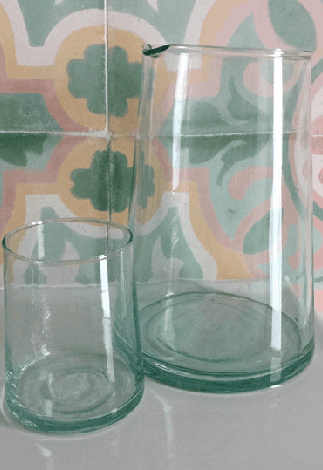 This gorgeous carafe is hand blown from recycled glass in a factory in Marrakesh. This carafe has a great hand and a modern shape with an old world touch because they are each one of a kind and made by a person. A person you are supporting with your purchase of these sustainably produced authentic pieces.