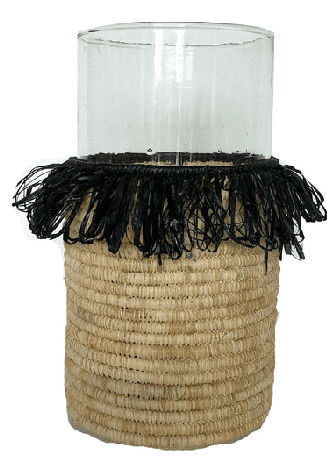 This gorgeous vase "sleeve" is handwoven in natural and black rafia with a handblown glass vase inside, removable for easy cleaning. Perfect to give your entryway or kitchen table an elegant yet relaxed vibe.