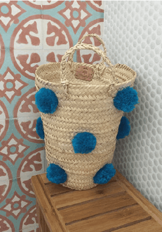 This happy pompom basket is hand-woven with straw and acrylic (pompoms) by local artisans in Marrakesh.  It is perfect as a planter or to store your kids' toys. It is a fun picnic basket or a charming tote to carry in the summer months. It will add an exotic touch to your kitchen, living room, entrance hall.