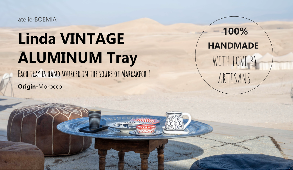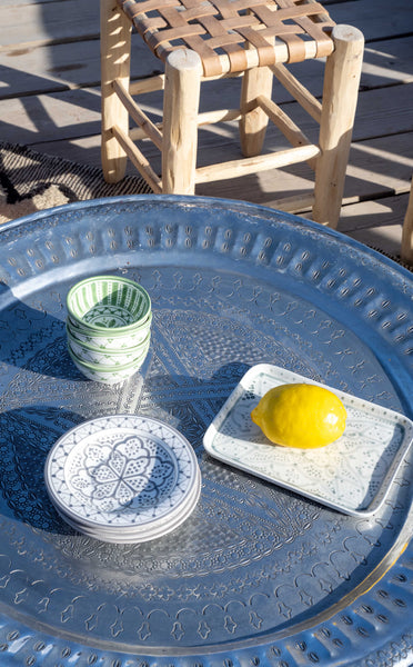 These beautiful unique aluminum trays are each one of a kind. We source them from a tiny shop in the souks of Marrakesh and each one is hand chosen for it's beautiful design and patina. They are light weight, durable and effective as a decorative or a serving piece.