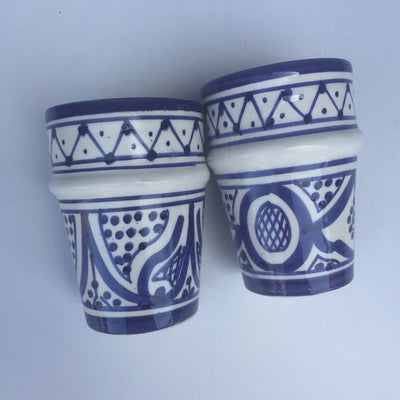 Our MODERN MOROCCAN Safi tea cups in the traditional Beldi shape come in SAFI and in BULLSEYE and we offer 6 different color ways so that you can mix and match to your heart’s content.  Whether for wine, water, tea, coffee or individual flower arrangements, these add style to any table setting!